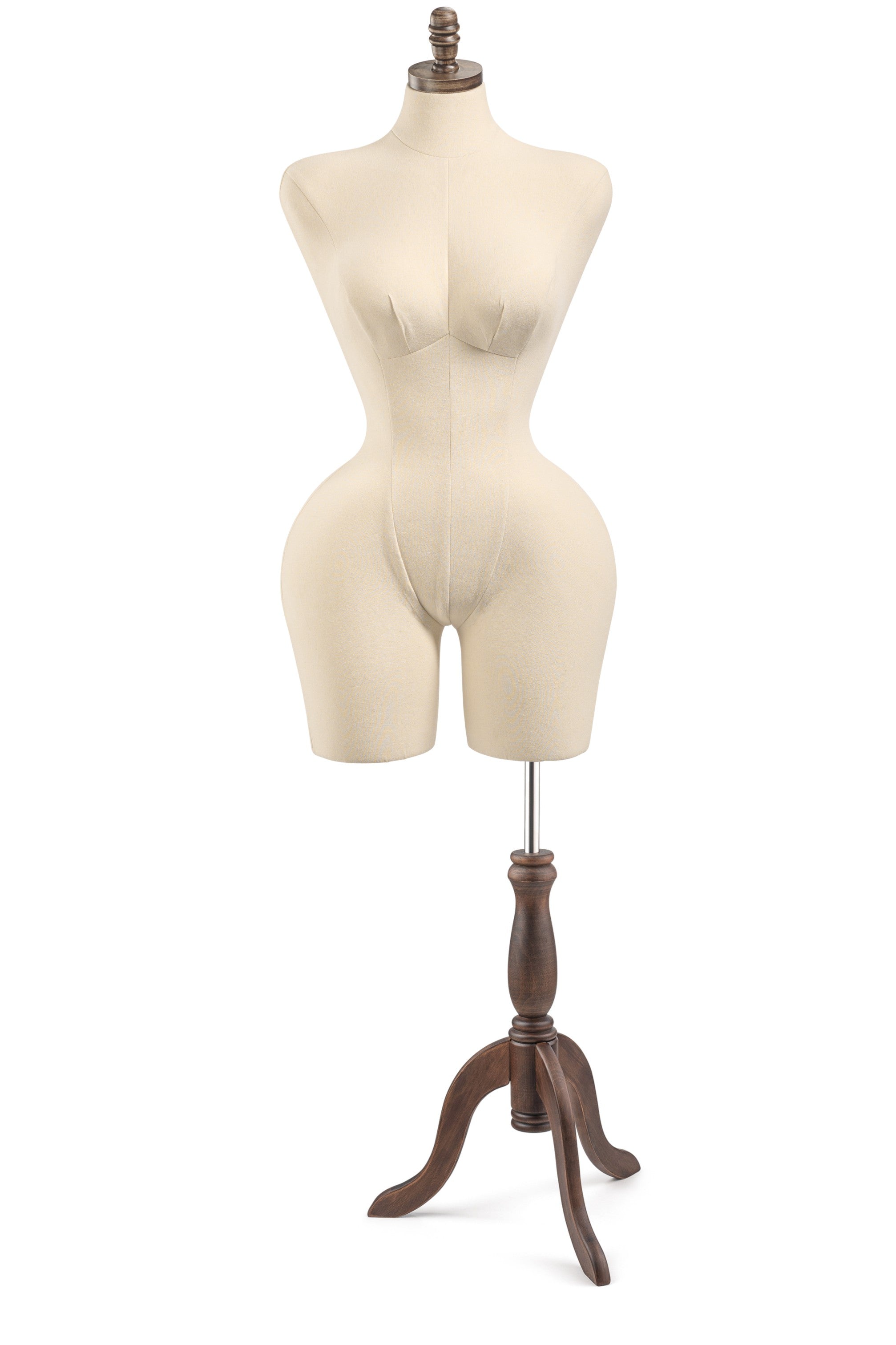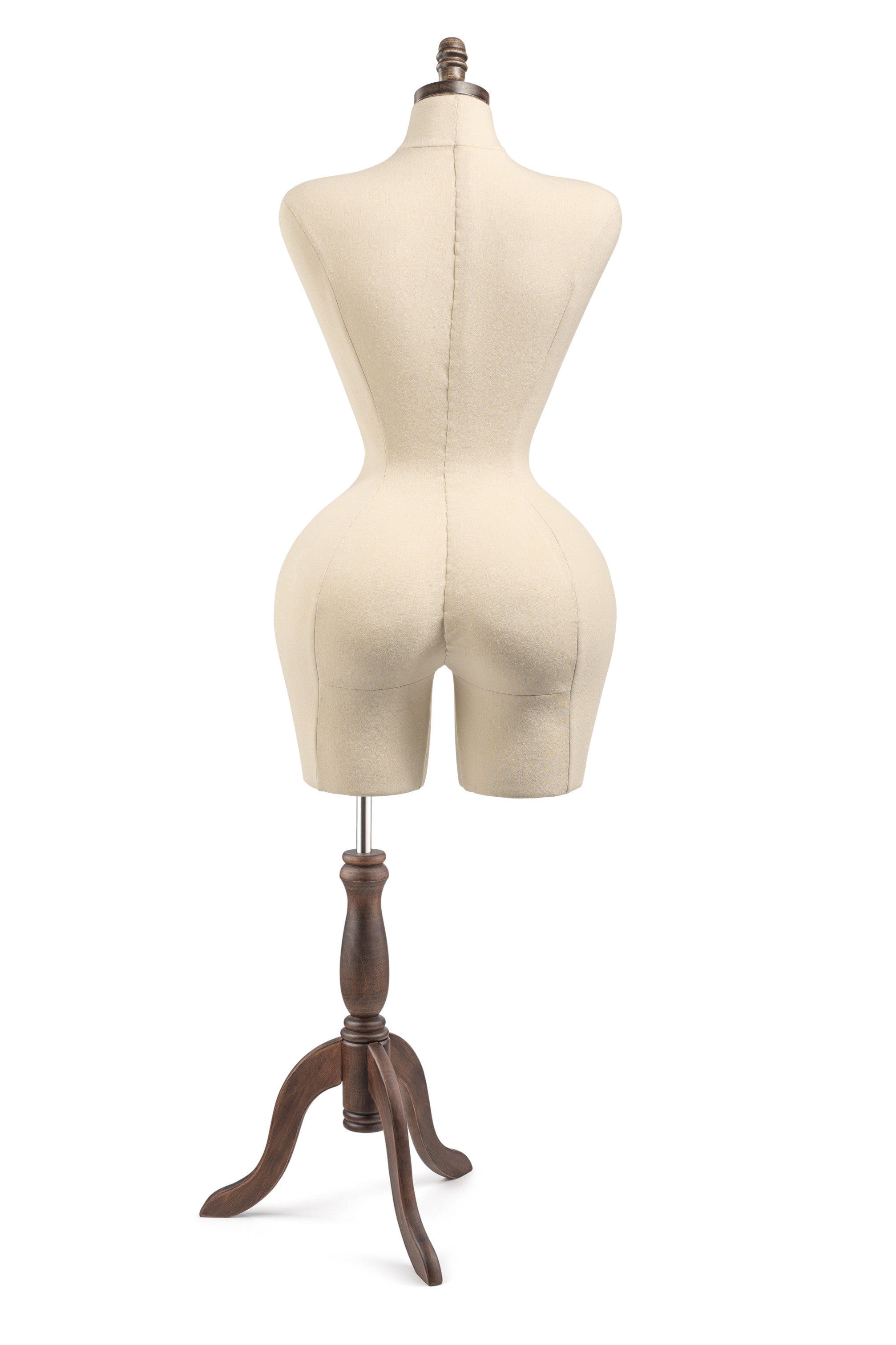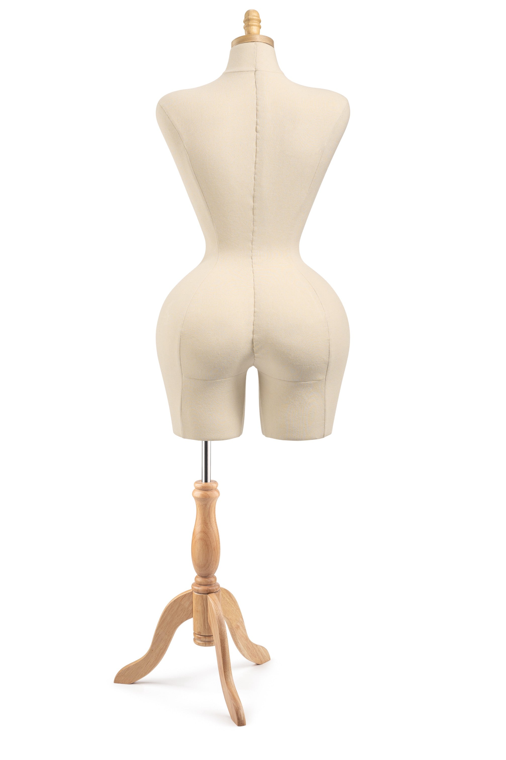 The torso is built around a durable plastic inner core, layered with dense foam for easy pinning, and wrapped in natural canvas fabric for a clean, professional finish.