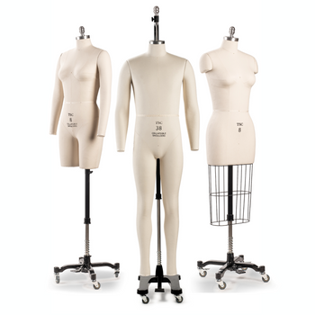 It is important to note that, despite the above distinctions, our professional dress forms are more similar to each other than they are different. They are all built from a tough fiberglass core using the same size charts. They are all wrapped in a layer of felt and then a tough and durable outer canvas fabric. All of the bases are heavy duty cast iron with functioning pedal-adjustable height.