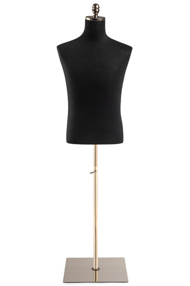 The torso is built around a durable plastic inner core, layered with dense foam for easy pinning, and wrapped in black jersey fabric for a clean, professional finish.